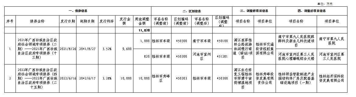 桂林市本级2022年第二批新增政府债券资金收回和调整情况表