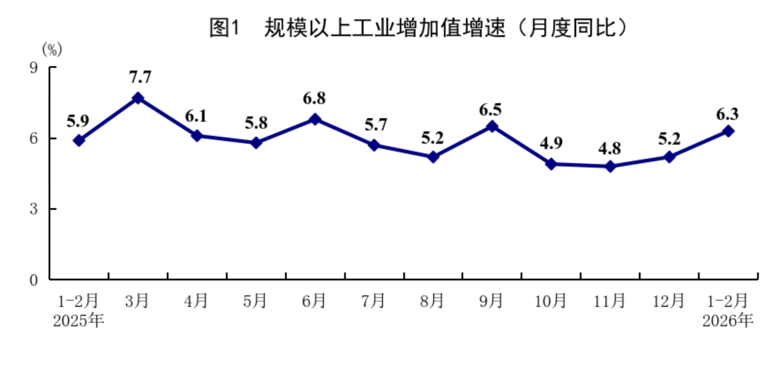 1—2月份,全国规模以上工业增加值同比增长6.3%,比上年12月份加快1.1个百分点。分三大门类看,采矿业增加值同比增长6.1%,制造业增长6.6%,电力、热力、燃气及水生产和供应业增长4.7%。装备制造业增加值同比增长9.3%,高技术制造业增加值增长13.1%,分别快于全部规模以上工业增加值3.0和6.8个百分点。分经济类型看,国有控股企业增加值同比增长4.2%;股份制企业增长6.9%,外商及港澳台投资企业增长4.0%;私营企业增长7.4%。分产品看,3D打印设备、锂离子电池、工业机器人产品产量同比分别增长54.1%、42.6%、31.1%。从环比看,2月份规模以上工业增加值比上月增长0.83%。2月份,制造业采购经理指数为49.0%;企业生产经营活动预期指数为53.2%,比上月上升0.6个百分点。