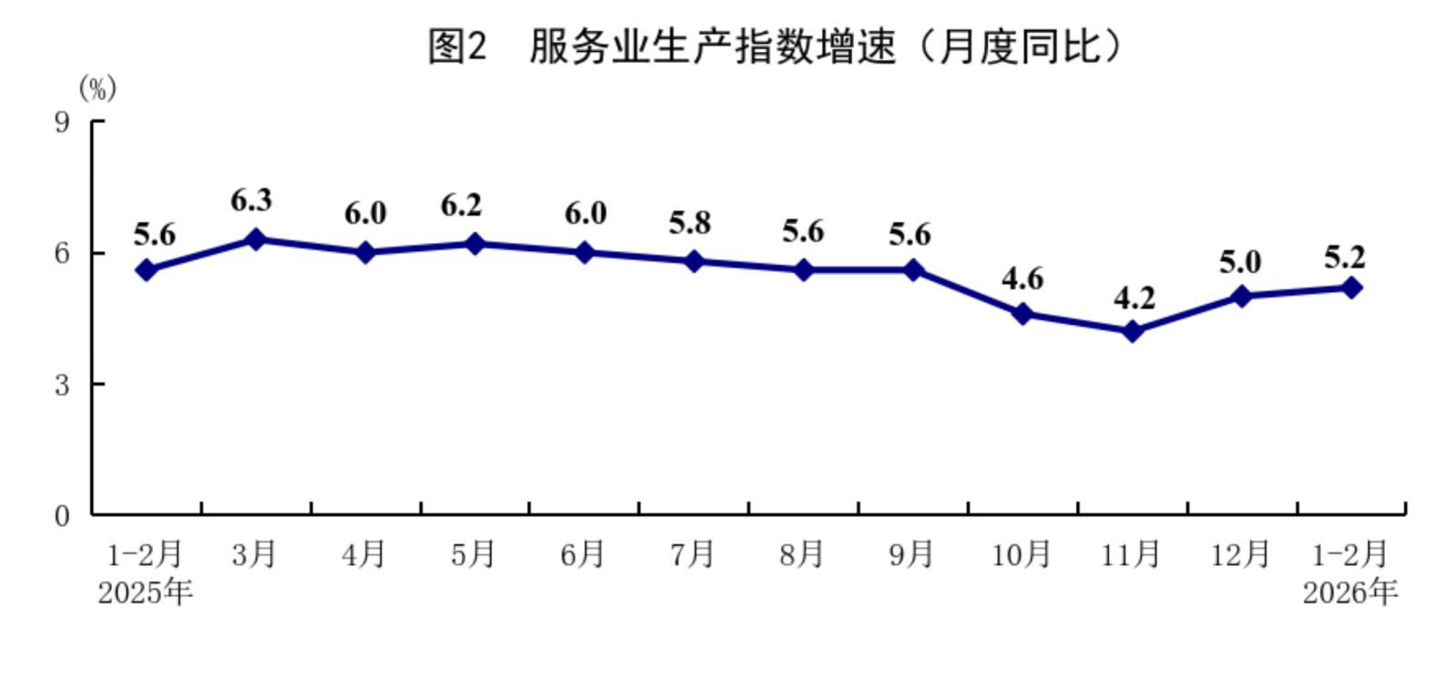 1—2月份,全国服务业生产指数同比增长5.2%,比上年12月份加快0.2个百分点。分行业看,信息传输、软件和信息技术服务业,租赁和商务服务业,金融业,交通运输、仓储和邮政业,住宿和餐饮业生产指数分别增长10.1%、8.2%、7.0%、6.3%、5.4%。2月份,服务业商务活动指数为49.7%,比上月上升0.2个百分点;服务业业务活动预期指数为55.8%。其中,住宿、餐饮、文化体育娱乐等行业商务活动指数位于60.0%以上高位景气区间。
