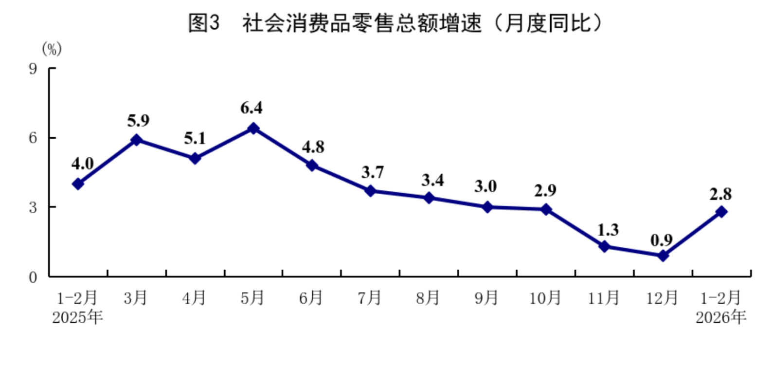 1—2月份,社会消费品零售总额86079亿元,同比增长2.8%,比上年12月份加快1.9个百分点。按经营单位所在地分,城镇消费品零售额74449亿元,增长2.7%;乡村消费品零售额11630亿元,增长3.2%。按消费类型分,商品零售额75815亿元,增长2.5%;餐饮收入10264亿元,增长4.8%。基本生活类和部分升级类商品销售增长较快。限额以上单位服装鞋帽针纺织品类、粮油食品类、通讯器材类、金银珠宝类商品零售额同比分别增长10.4%、10.2%、17.8%、13.0%。从环比看,2月份社会消费品零售总额比上月增长0.81%。1—2月份,服务零售额同比增长5.6%,比上年全年加快0.1个百分点。其中,通讯信息服务类、旅游咨询租赁服务类、文体休闲服务类零售额较快增长。1—2月份,全国网上商品和服务零售额32546亿元,同比增长9.2%。其中,网上商品零售额20812亿元,增长10.3%,占社会消费品零售总额的比重为24.2%;网上服务零售额11734亿元,增长7.3%。