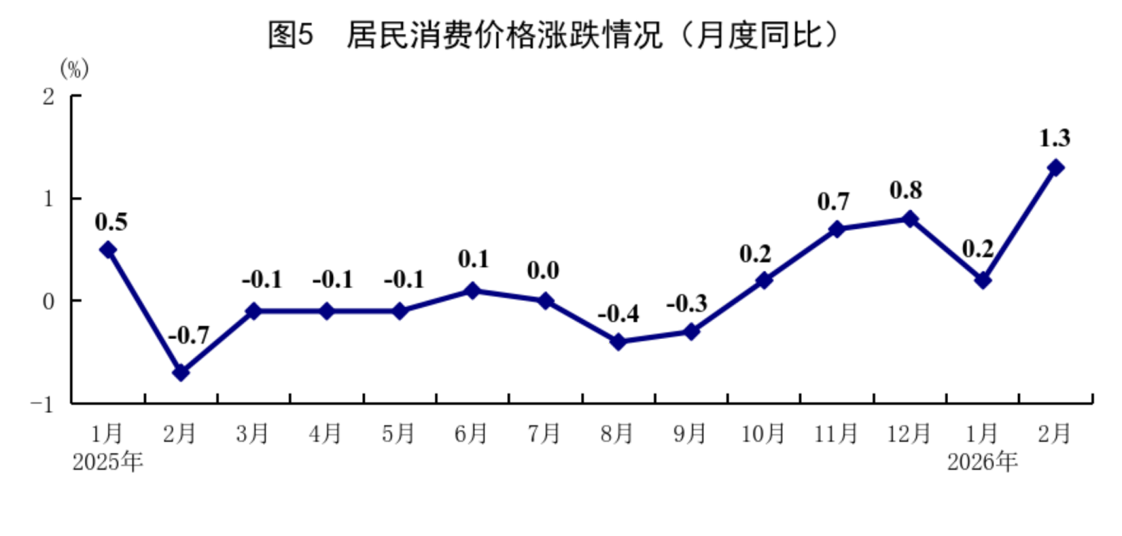 1—2月份,全国居民消费价格(CPI)同比上涨0.8%,其中1月份上涨0.2%,2月份上涨1.3%。分类别看,1—2月份,食品烟酒及在外餐饮价格同比上涨0.6%,衣着价格上涨1.9%,居住价格下降0.1%,生活用品及服务价格上涨2.7%,交通通信价格下降2.1%,教育文化娱乐价格上涨1.0%,医疗保健价格上涨1.8%,其他用品及服务价格上涨14.3%。在食品烟酒及在外餐饮价格中,猪肉价格下降11.2%,粮食价格下降0.2%,鲜果价格上涨4.5%,鲜菜价格上涨8.8%。扣除食品和能源价格后的核心CPI同比上涨1.3%。从环比看,1月份,全国居民消费价格上涨0.2%,2月份上涨1.0%。