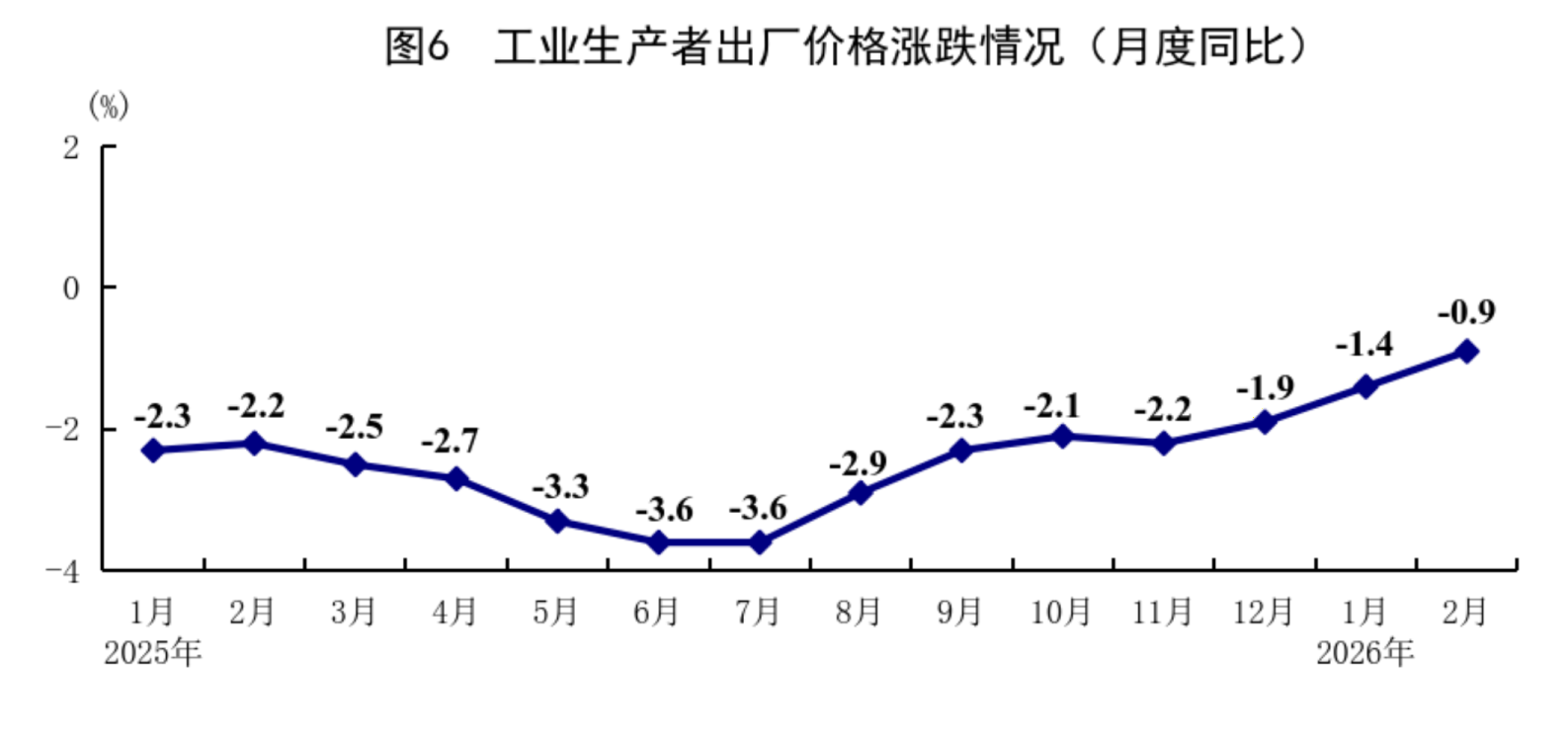 1—2月份,全国工业生产者出厂价格同比下降1.2%。分月看,1月份同比下降1.4%,环比上涨0.4%;2月份同比下降0.9%,环比上涨0.4%。1—2月份,全国工业生产者购进价格同比下降1.1%。