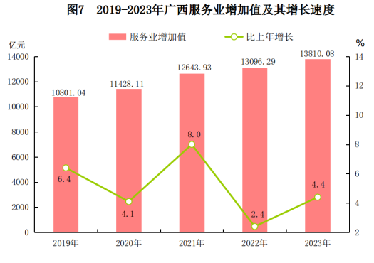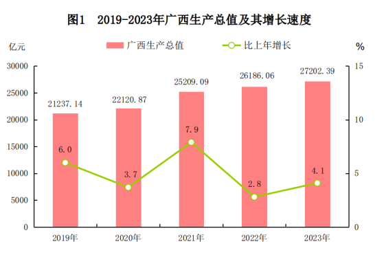 区域发展活力稳步释放。分区域看[11],全年北部湾经济区生产总值10216.86亿元,比上年增长5.1%;西江经济带生产总值12854.56亿元,增长3.1%;左右江革命老区生产总值4366.69亿元,增长4.9%。