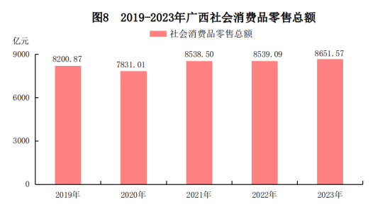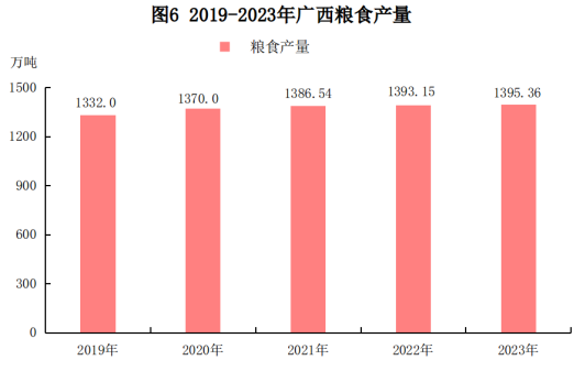 本公报中城镇新增就业、社会保障数据来自自治区人力资源社会保障厅;医疗保障数据来自自治区医保局;财政数据来自自治区财政厅;物价、城乡居民收入和支出、恩格尔系数、农民工、部分农业数据来自国家统计局广西调查总队;进出口数据来自南宁海关;实际利用外资、对外承包工程和劳务合作等数据来自自治区商务厅;金融数据来自中国人民银行广西壮族自治区分行;证券数据来自中国证券监督管理委员会广西监管局;保险数据来自国家金融监督管理总局广西监管局;公路里程、港口数据来自自治区交通运输厅;旅客、货物运输量和周转量数据来自自治区交通运输厅、中国铁路南宁局集团有限公司和广西机场集团;铁路营业里程、高速铁路数据来自中国铁路南宁局集团有限公司;汽车保有量数据来自自治区公安厅交警总队;邮政业务数据来自自治区邮政管理局;电信业务数据来自自治区通信管理局;教育数据来自自治区教育厅;安排科技计划项目、技术合同等数据来自自治区科技厅;经营主体、专利数据、质量检验、标准制定修订等数据来自自治区市场监督管理局;艺术表演团体、博物馆、公共图书馆、文化馆、非物质文化遗产、旅游等数据来自自治区文化和旅游厅;广播电视数据来自自治区新闻出版广电局;医疗卫生数据来自自治区卫生健康委;社会服务及救助数据来自自治区党委社会工作部;国有建设用地供应、地质灾害数据来自自治区自然资源厅;用水量数据来自自治区水利厅;林业、自然保护区等数据来自自治区林业局;环境监测数据来自自治区生态环境厅;气象预警、平均气温、热带气旋等数据来自自治区气象局;海洋观测站、海洋监测预报、海洋灾害等数据来自自治区海洋局;地震数据来自自治区地震局;其他数据均来自自治区统计局。