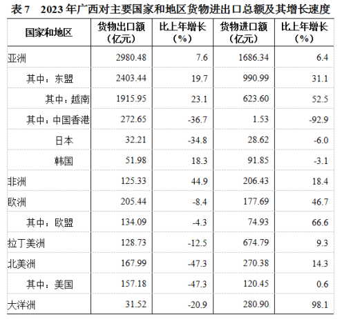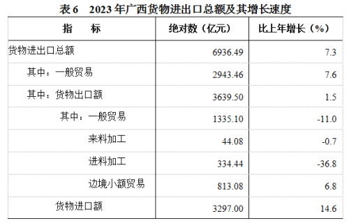 全年货物进出口总额6936.49亿元,比上年增长7.3%。其中,出口3639.50亿元,增长1.5%;进口3297.00亿元,增长14.6%。进出口顺差(进口小于出口)342.50亿元。对东盟国家进出口总额3394.44亿元,比上年增长22.8%。其中,出口2403.44亿元,增长19.7%;进口990.99亿元,增长31.1%。对“一带一路”共建国家[21]进出口总额4961.61亿元,比上年增长19.0%。其中,出口2809.82亿元,增长16.8%;进口2151.79亿元,增长22.1%。对《区域全面经济伙伴关系协定》(RCEP)其他成员国[22]进出口额3905.13亿元,比上年增长23.7%。其中,出口2517.13亿元,增长17.7%;进口1388.00亿元,增长36.2%。
