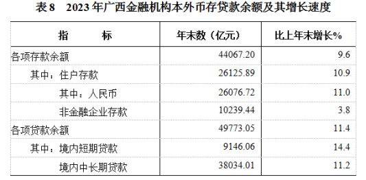 年末金融机构本外币各项存款余额44067.20亿元,比年初增加3854.82亿元,其中人民币各项存款余额43886.89亿元,增加3854.24亿元。年末金融机构本外币各项贷款余额49773.05亿元,比年初增加5083.26亿元,其中人民币各项贷款余额49388.57亿元,增加5191.33亿元。