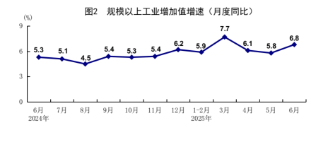 上半年,全国规模以上工业增加值同比增长6.4%。分三大门类看,采矿业增加值同比增长6.0%,制造业增长7.0%,电力、热力、燃气及水生产和供应业增长1.9%。装备制造业增加值同比增长10.2%,高技术制造业增加值增长9.5%,增速分别快于全部规模以上工业3.8和3.1个百分点。分经济类型看,国有控股企业增加值同比增长4.2%;股份制企业增长6.9%,外商及港澳台投资企业增长4.3%;私营企业增长6.7%。分产品看,3D打印设备、新能源汽车、工业机器人产品产量同比分别增长43.1%、36.2%、35.6%。6月份,规模以上工业增加值同比增长6.8%,环比增长0.50%。6月份,制造业采购经理指数为49.7%,比上月上升0.2个百分点;企业生产经营活动预期指数为52.0%。1-5月份,全国规模以上工业企业实现利润总额27204亿元,同比下降1.1%。