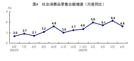 上半年,社会消费品零售总额245458亿元,同比增长5.0%,比一季度加快0.4个百分点。按经营单位所在地分,城镇消费品零售额213050亿元,同比增长5.0%;乡村消费品零售额32409亿元,增长4.9%。按消费类型分,商品零售额217978亿元,增长5.1%;餐饮收入27480亿元,增长4.3%。基本生活类和部分升级类商品销售增势较好,限额以上单位粮油食品类、体育娱乐用品类、金银珠宝类商品零售额分别增长12.3%、22.2%、11.3%。消费品以旧换新政策持续显效,限额以上单位家用电器和音像器材类、文化办公用品类、通讯器材类、家具类商品零售额分别增长30.7%、25.4%、24.1%、22.9%。全国网上零售额74295亿元,同比增长8.5%。其中,实物商品网上零售额61191亿元,增长6.0%,占社会消费品零售总额的比重为24.9%。6月份,社会消费品零售总额同比增长4.8%,环比下降0.16%。上半年,服务零售额同比增长5.3%,比一季度加快0.3个百分点。