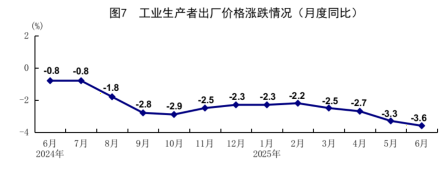 上半年,全国工业生产者出厂价格同比下降2.8%。其中,6月份同比下降3.6%,环比下降0.4%。上半年,工业生产者购进价格同比下降2.9%。其中,6月份同比下降4.3%,环比下降0.7%。