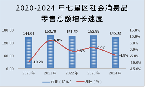 2024年七星区社会消费品零售总额145.32亿元,比上年下降4.9%。限上批发业销售额增长16.1%;限上零售业销售额下降11.3%;限上住宿业营业额下降16.7%;限上餐饮业营业额下降6.0%。