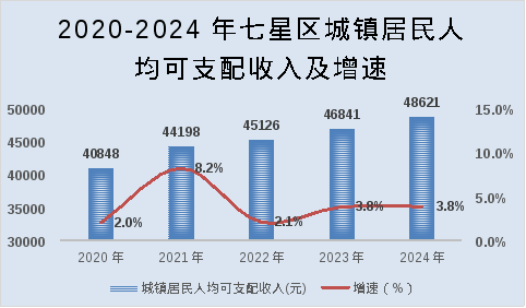 2024年,七星区居民人均可支配收入比上年增长3.8%。其中,城镇居民人均可支配收入48621元,增长3.8%。