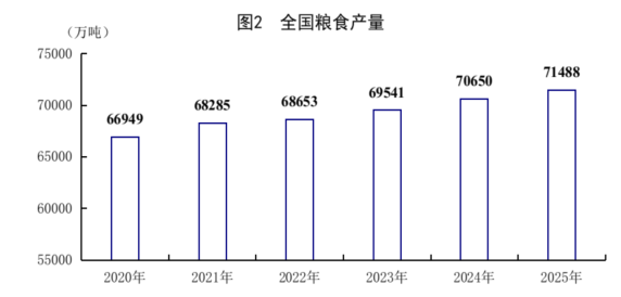 全年全国粮食总产量71488万吨,比上年增加838万吨,增长1.2%。其中,夏粮产量14975万吨,下降0.1%;早稻产量2851万吨,增长1.2%;秋粮产量53662万吨,增长1.5%。分品种看,小麦产量14007万吨,基本持平;玉米产量30124万吨,增长2.1%;稻谷产量20904万吨,增长0.7%;大豆产量2091万吨,增长1.3%。全年猪牛羊禽肉产量10072万吨,比上年增长4.2%,首次超过1亿吨。其中,猪肉产量5938万吨,增长4.1%;牛肉产量801万吨,增长2.8%;羊肉产量496万吨,下降4.2%;禽肉产量2837万吨,增长6.7%。牛奶产量4091万吨,增长0.3%;禽蛋产量3498万吨,下降2.5%。全年生猪出栏71973万头,增长2.4%;年末生猪存栏42967万头,增长0.5%。