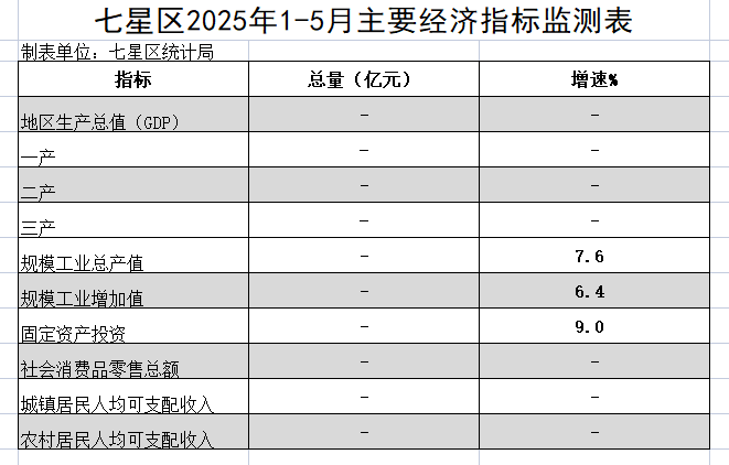 七星区2025年1-5月主要经济指标监测表