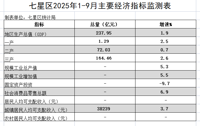 七星区2025年1-9月主要经济指标监测表