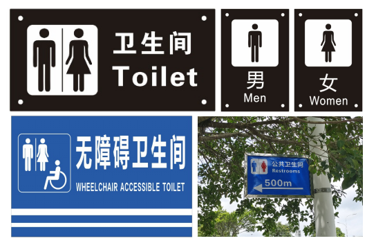 据统计,我辖区内市政公厕均按照统一标准配套安装了醒目的指示牌以及标识牌,文字简单清楚,且英文标识均按照市外事办专家的翻译标准标识清楚,能够很好的给予如厕人士指引,具体如下图: