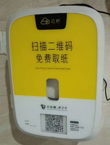 我辖区内主要路段公厕安装的“云纸”免费取纸设备由“云纸”公司安装(如下图)。该设备可在扫码且关注其公众号或观看视频后每人每天免费领取3次纸巾,每次出纸量为60-80mm。设备无纸或故障后,可拨打设备上联系电话报修。在此,我部门仅能负责对该设备的外观卫生进行清洁工作。