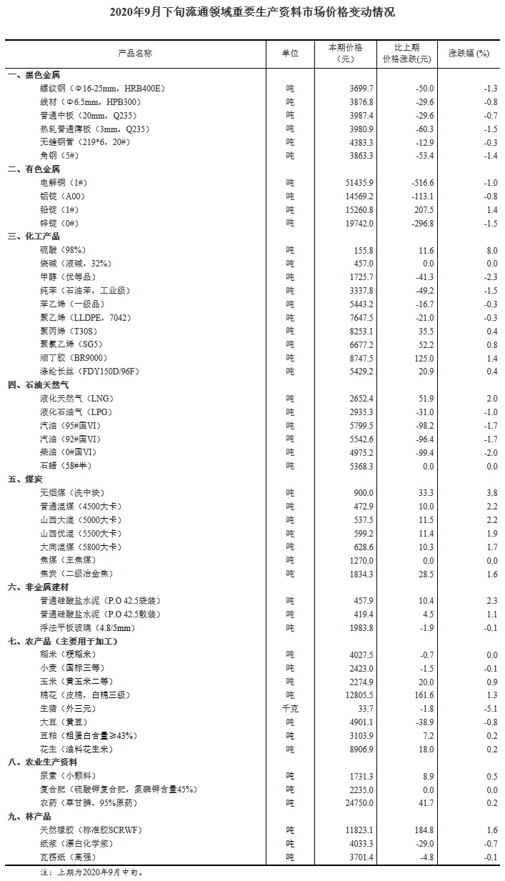 据对全国流通领域9大类50种重要生产资料市场价格的监测显示,2020年9月下旬与9月中旬相比,22种产品价格上涨,23种下降,5种持平。