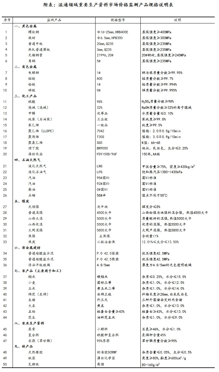 流通领域重要生产资料市场价格监测内容包括9大类50种产品的价格。类别与产品规格说明详见附表。