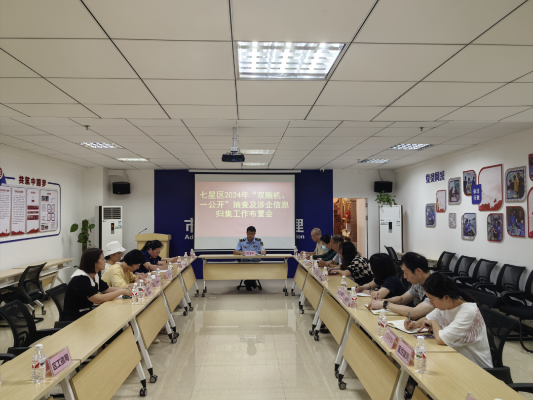 2024年6月20日,七星区召开2024年“双随机、一公开”抽查及涉企信息归集工作布置会,会议由七星区市场监督管理局副局长熊学军同志主持,事中事后监管联席会议成员单位参加会议。