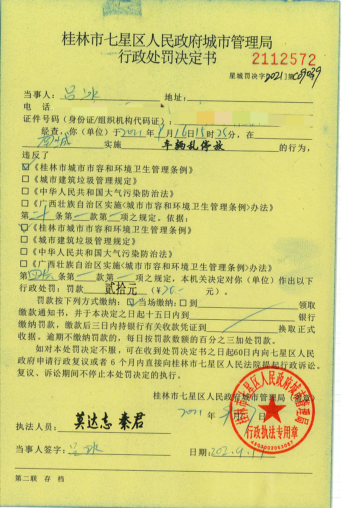 桂林市七星区城市管理局行政处罚决定书星城罚决字〔2021〕C09039号-吕冰