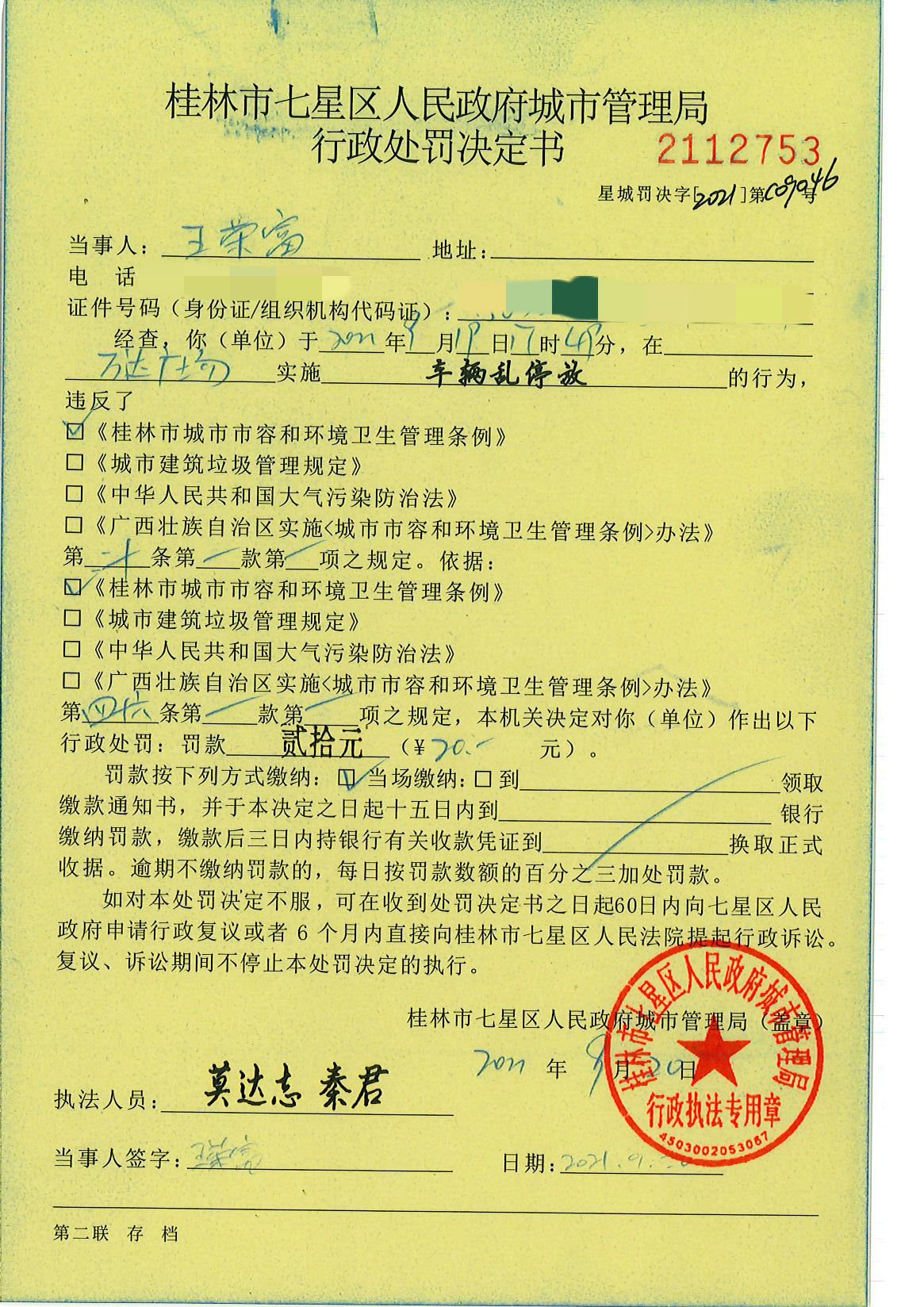 桂林市七星区城市管理局行政处罚决定书星城罚决字〔2021〕C09046号-王荣富