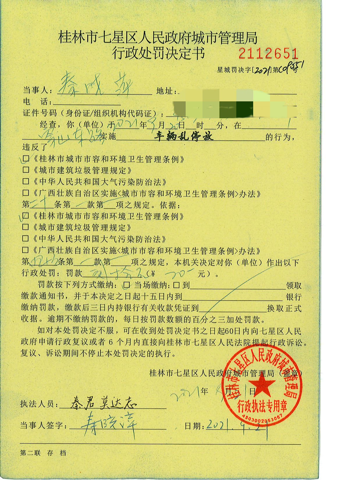 桂林市七星区城市管理局行政处罚决定书星城罚决字〔2021〕C09051号-秦晓萍