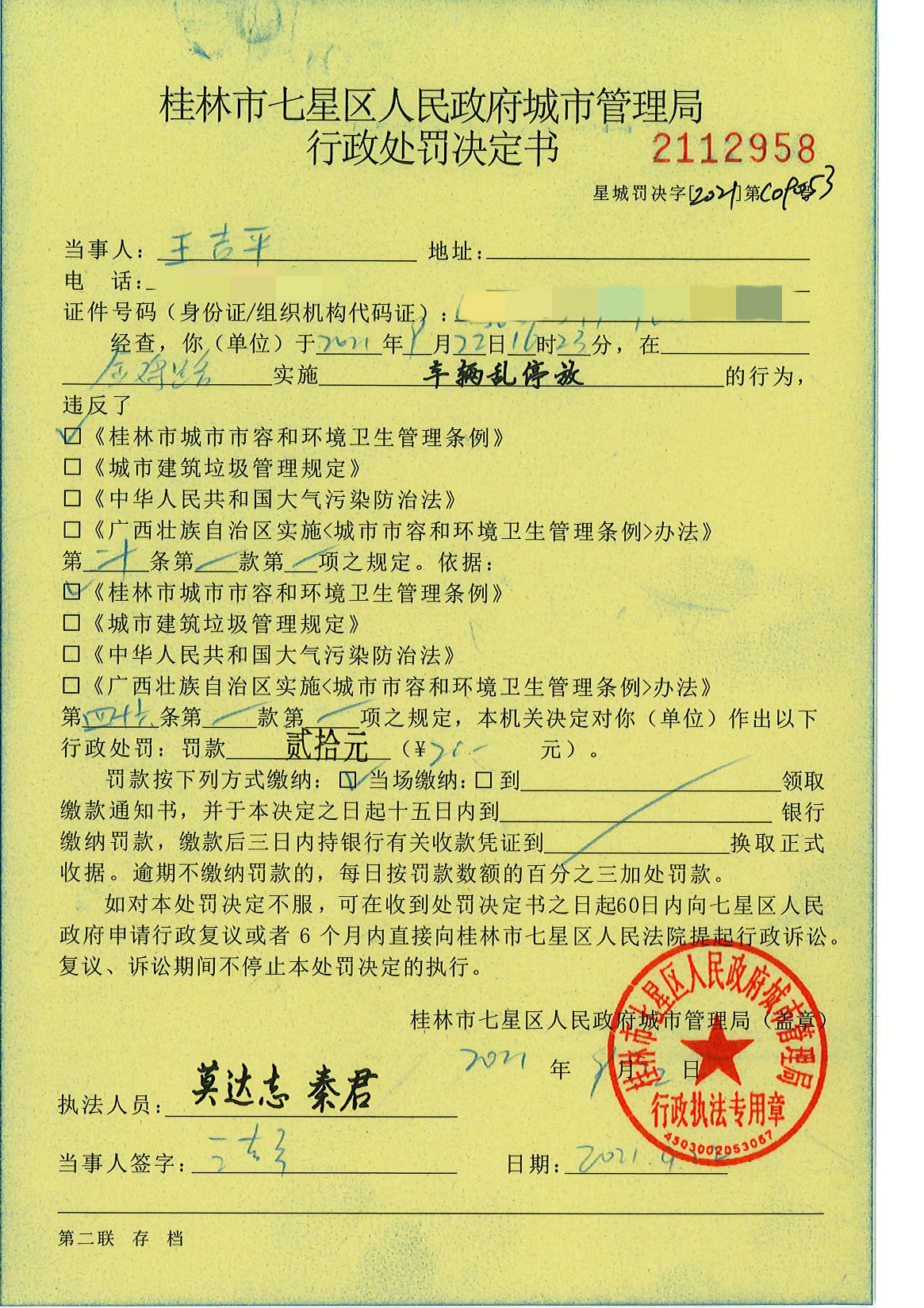 桂林市七星区城市管理局行政处罚决定书星城罚决字〔2021〕C09053号-王吉平