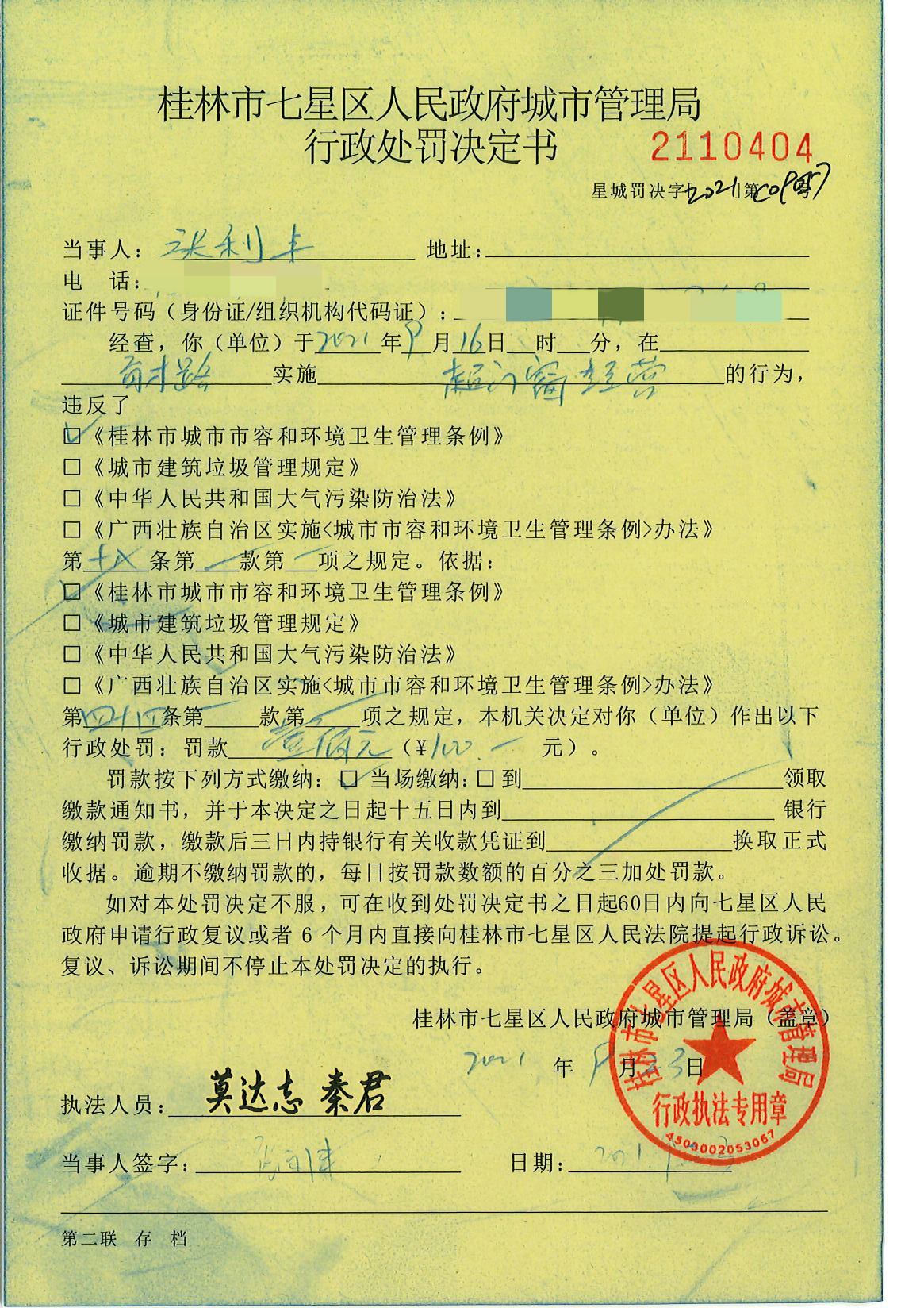 桂林市七星区城市管理局行政处罚决定书星城罚决字〔2021〕C09057号-张利丰