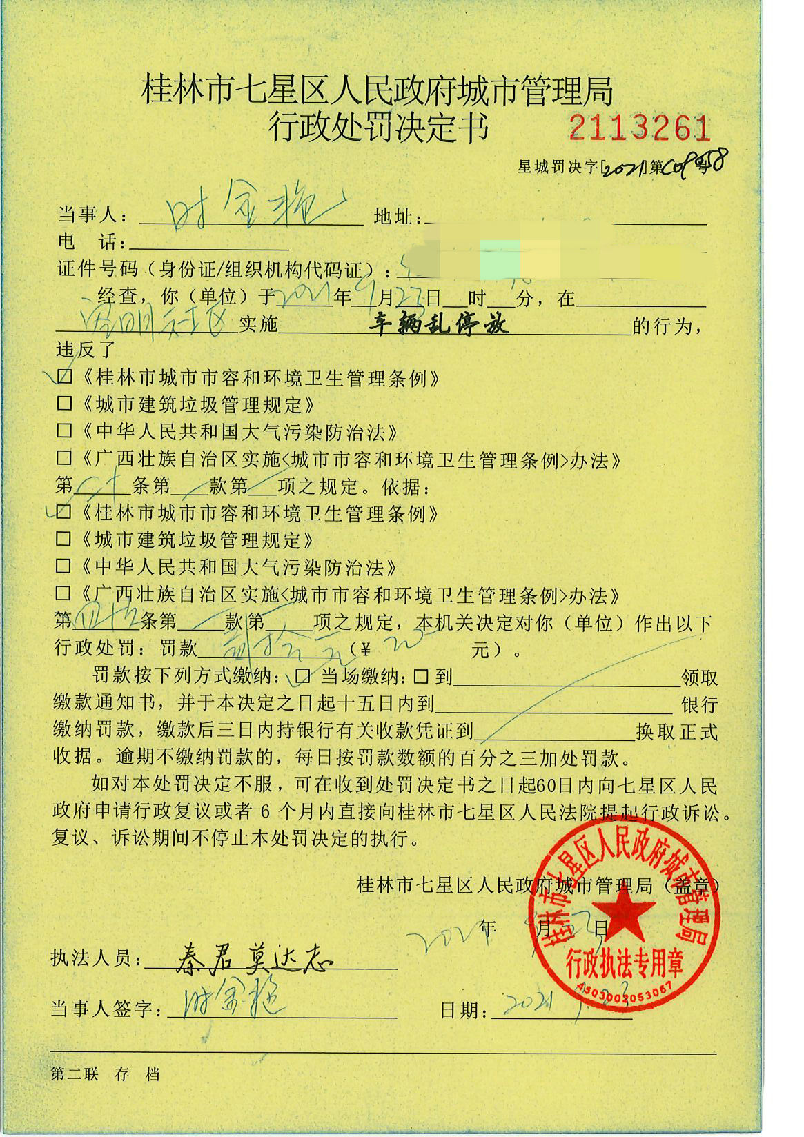 桂林市七星区城市管理局行政处罚决定书星城罚决字〔2021〕C09058号-时金艳
