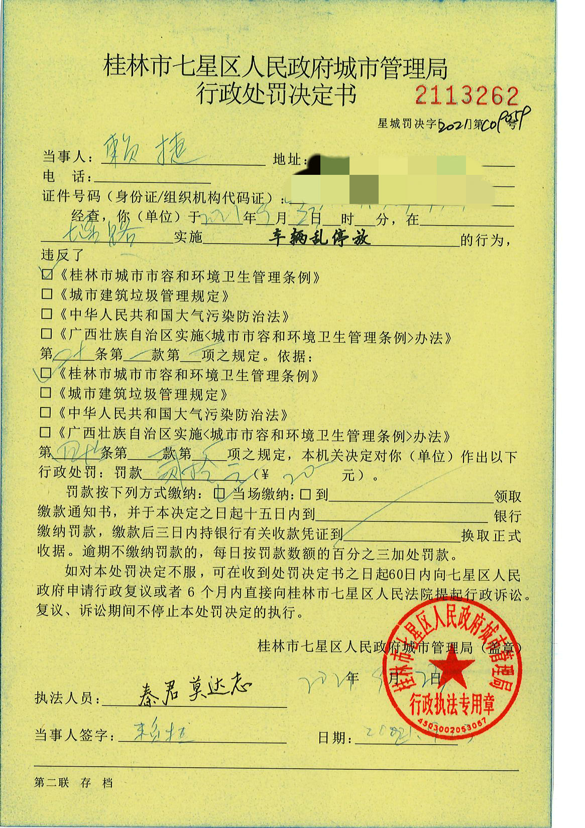 桂林市七星区城市管理局行政处罚决定书星城罚决字〔2021〕C09059号-赖捷