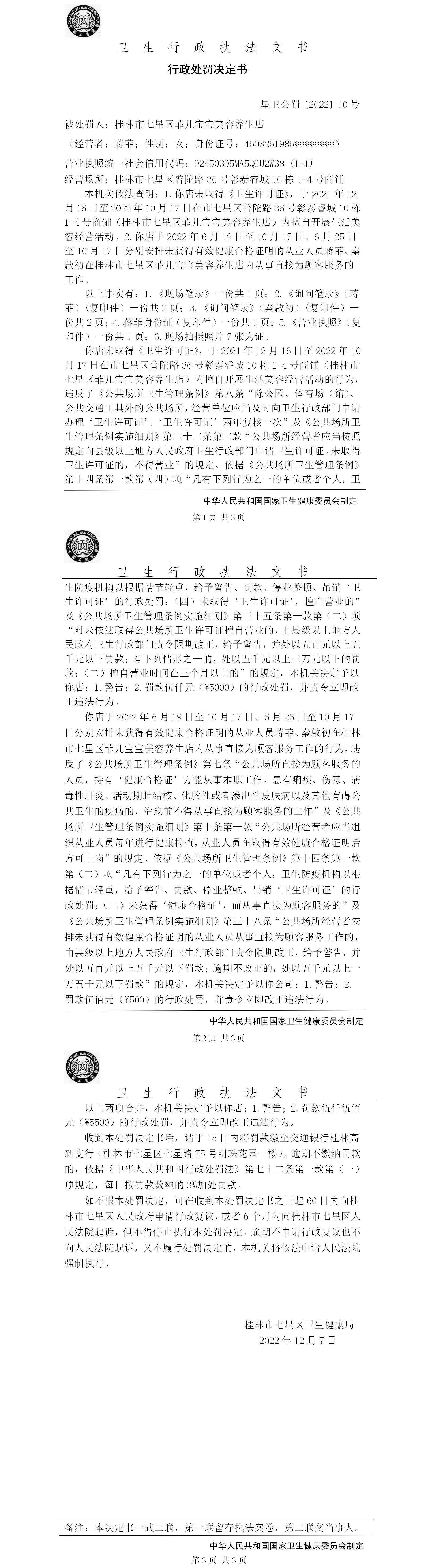 桂林市七星区卫生健康局行政处罚决定书(星卫公罚〔2022〕10号)