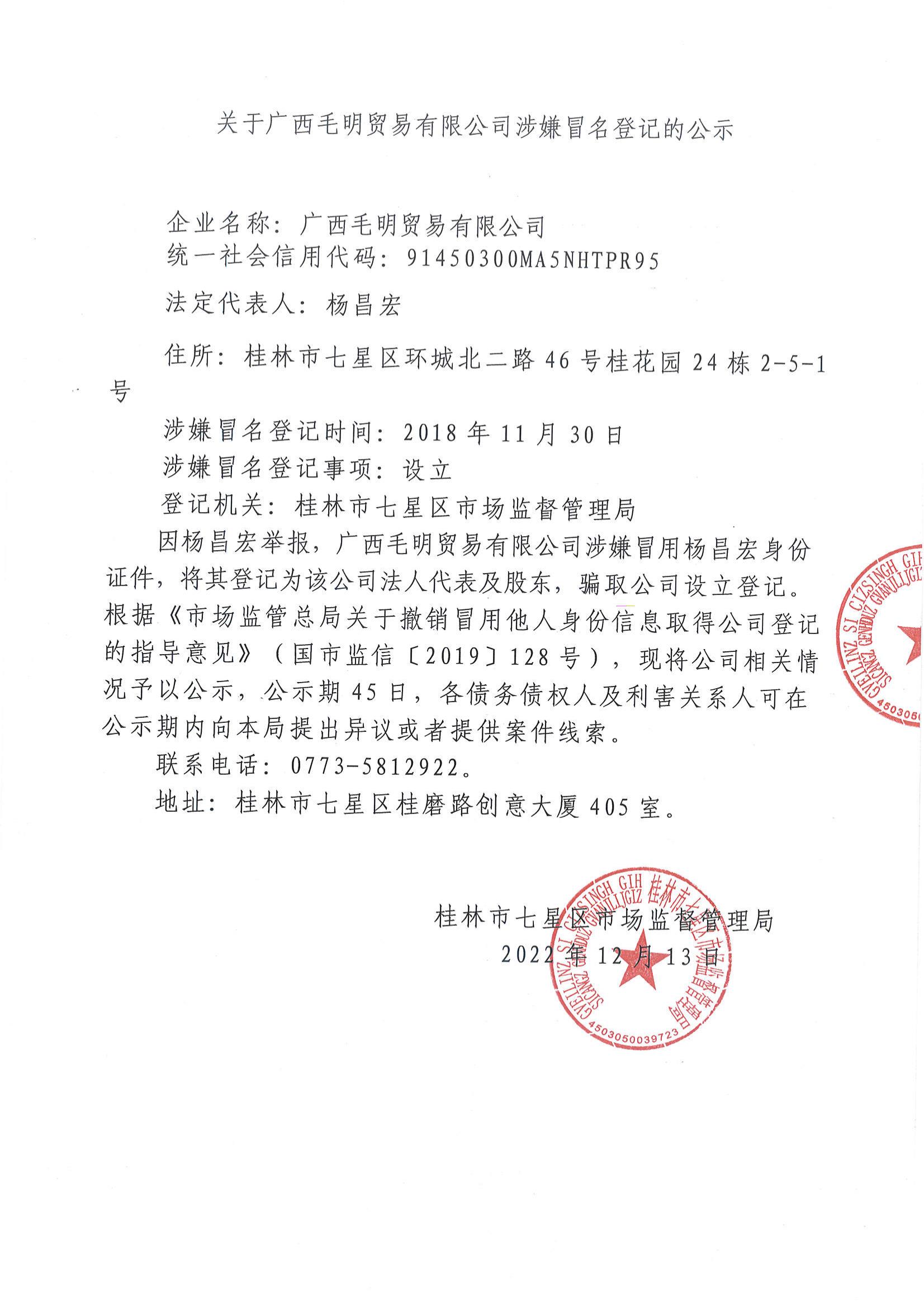 关于广西毛明贸易有限公司涉嫌冒名登记的公示