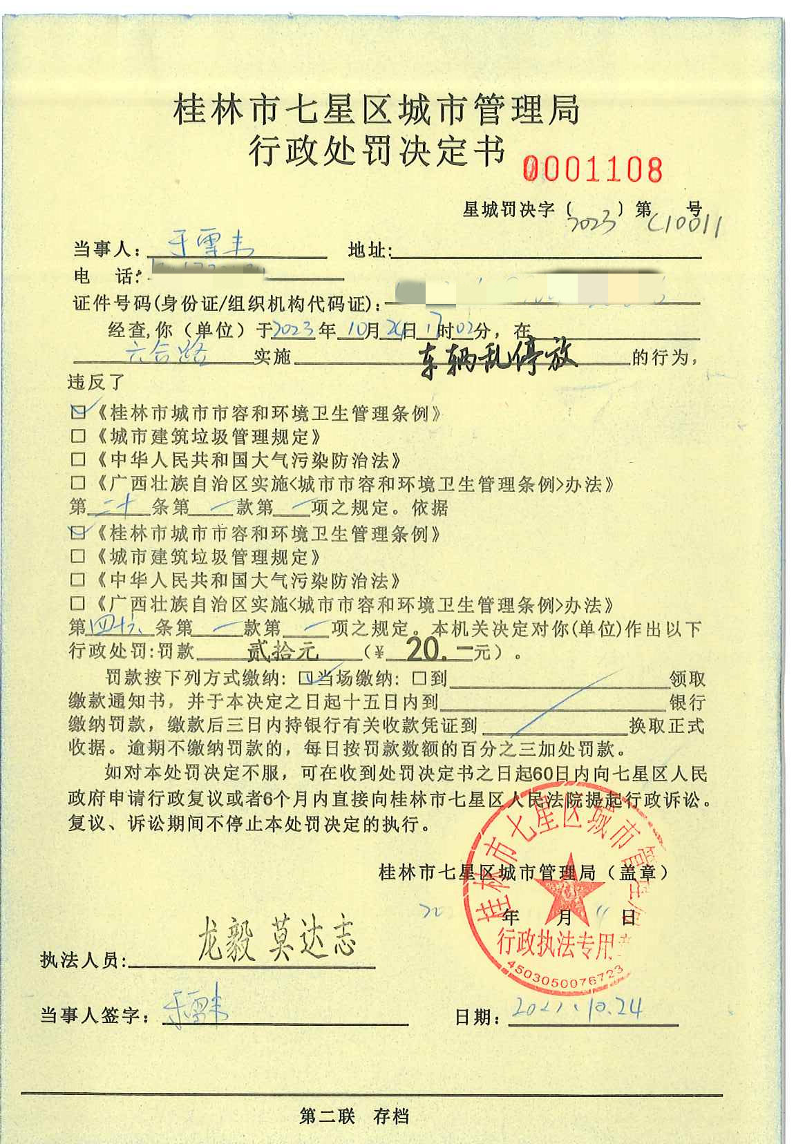 桂林市七星区城市管理局行政处罚决定书星城罚决字〔2023〕第C10011号-于雪韦