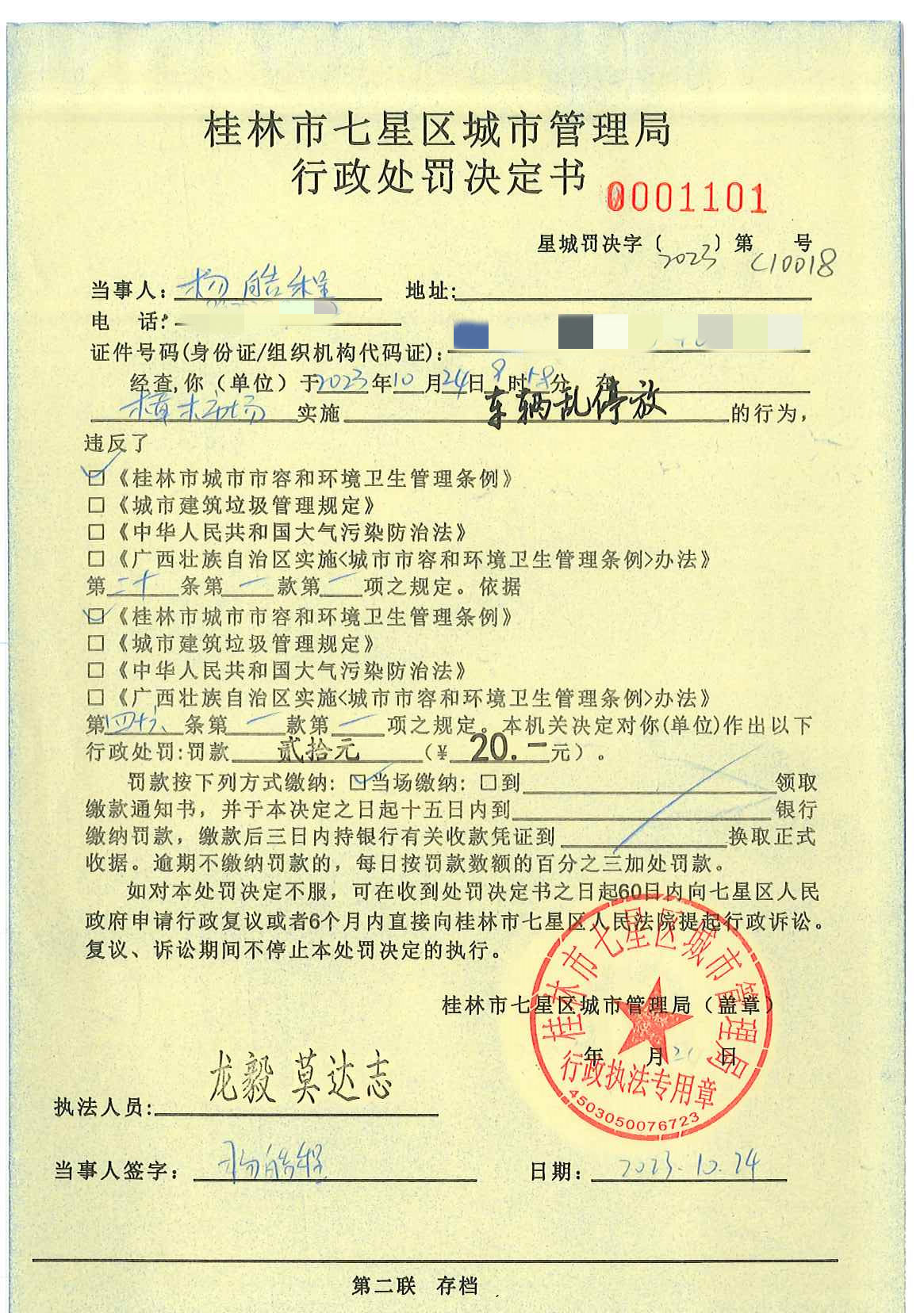 桂林市七星区城市管理局行政处罚决定书星城罚决字〔2023〕第C10018号-杨皓程