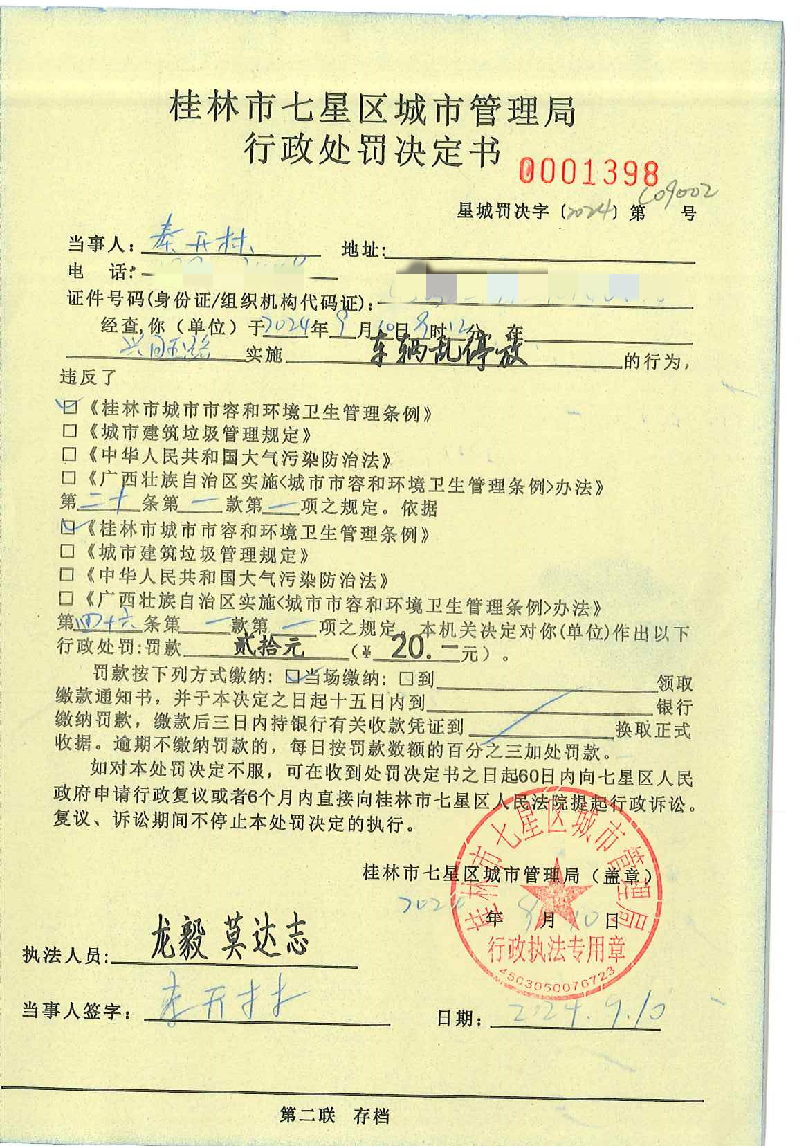 桂林市七星区城市管理局行政处罚决定书星城罚决字【2024】第C09002号