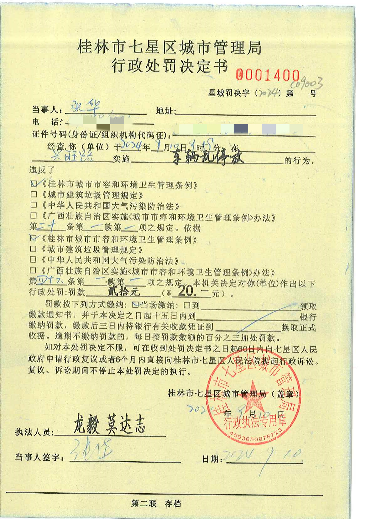 桂林市七星区城市管理局行政处罚决定书星城罚决字【2024】第C09003号