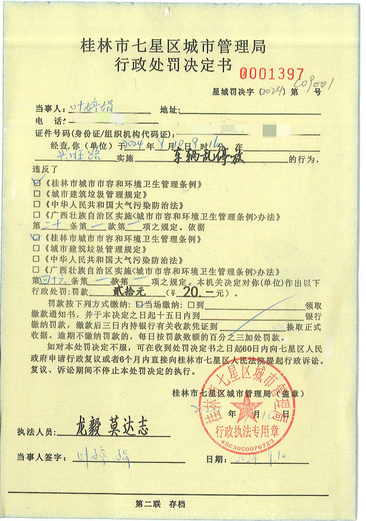 桂林市七星区城市管理局行政处罚决定书星城罚决字【2024】第C09001号