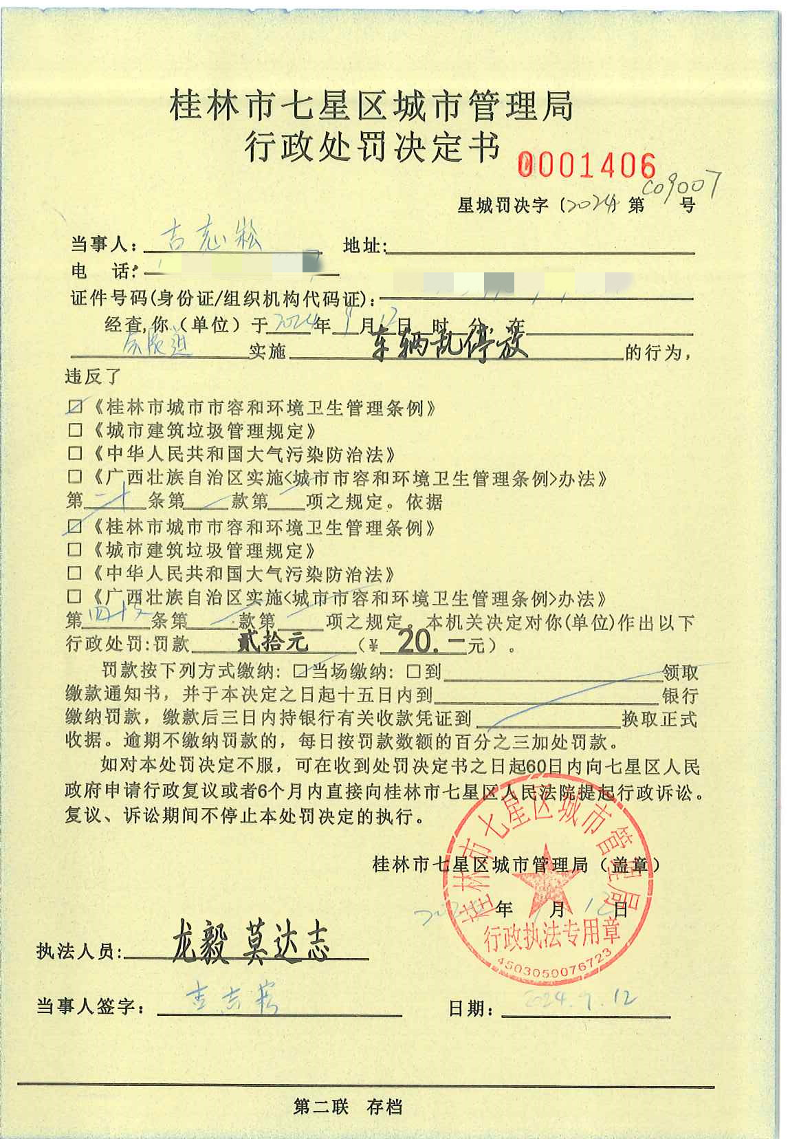 桂林市七星区城市管理局行政处罚决定书星城罚决字【2024】第C09007号