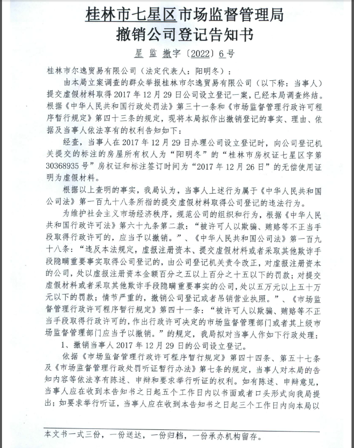 桂林市七星区市场监督管理局撤销公司登记告知书星监撤字〔2022〕6号-桂林市尔逸贸易有限公司