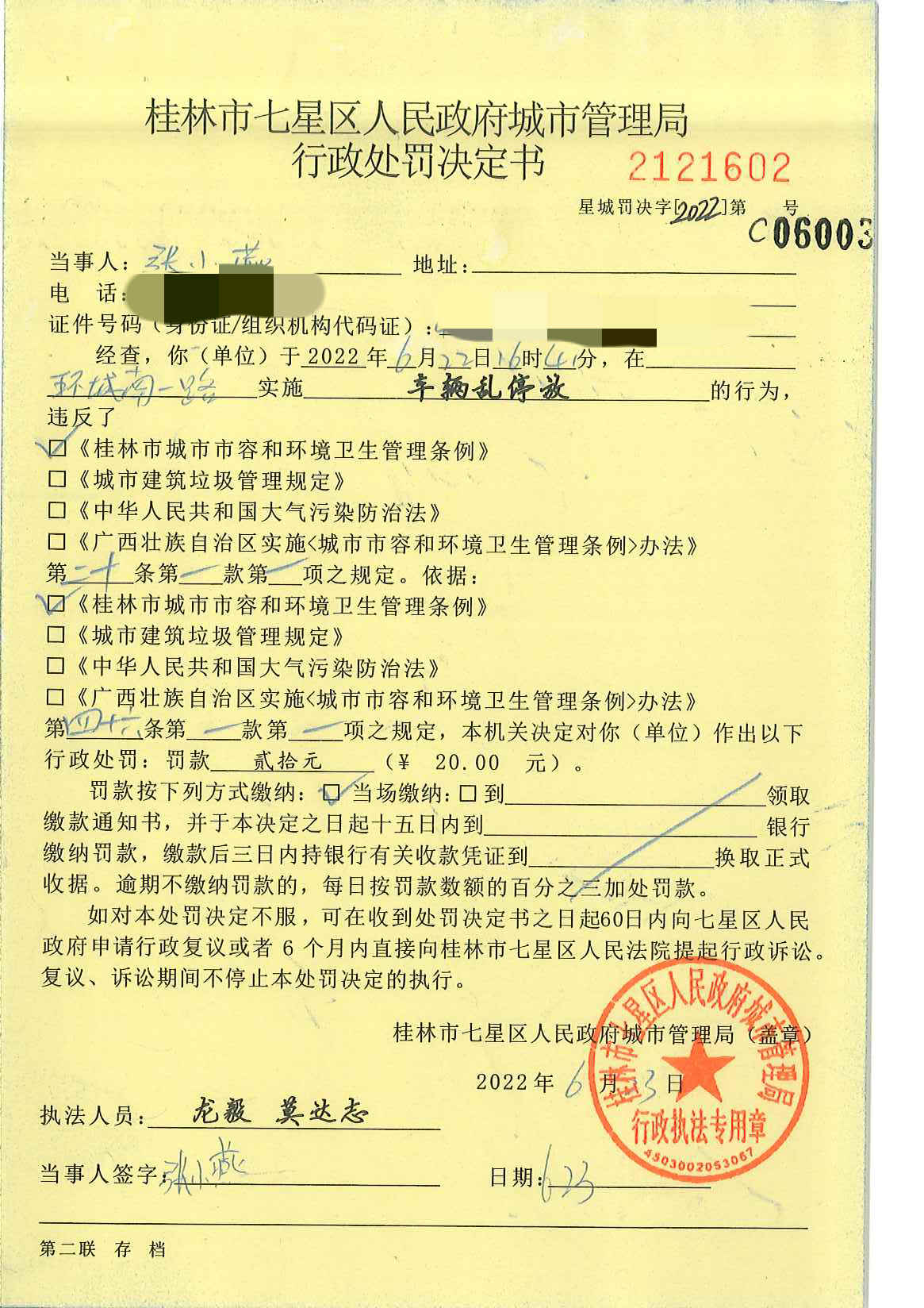 桂林市七星区城市管理局行政处罚决定书星城罚决字〔2022〕第C06003号-张小燕