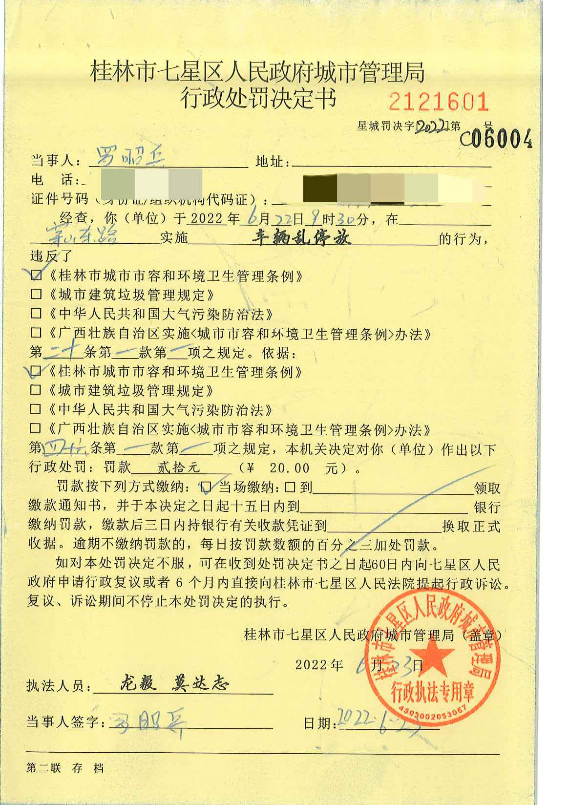 桂林市七星区城市管理局行政处罚决定书星城罚决字〔2022〕第C06004号-罗昭兵