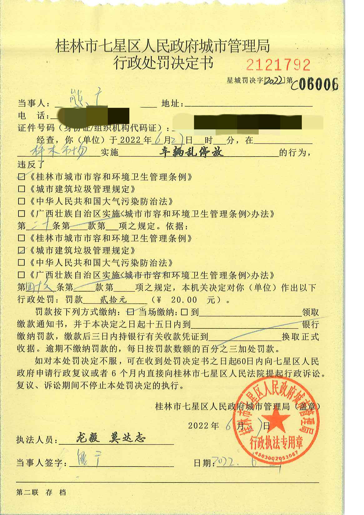 桂林市七星区城市管理局行政处罚决定书星城罚决字〔2022〕第C06006号-熊广
