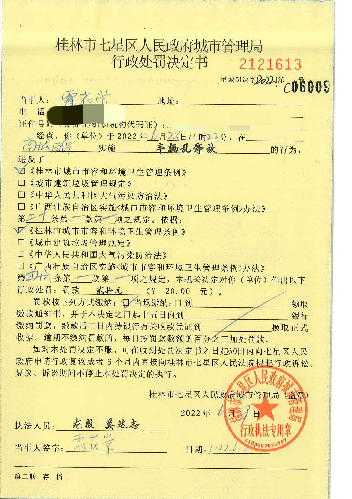 桂林市七星区城市管理局行政处罚决定书星城罚决字〔2022〕第C06009号-霍花崇