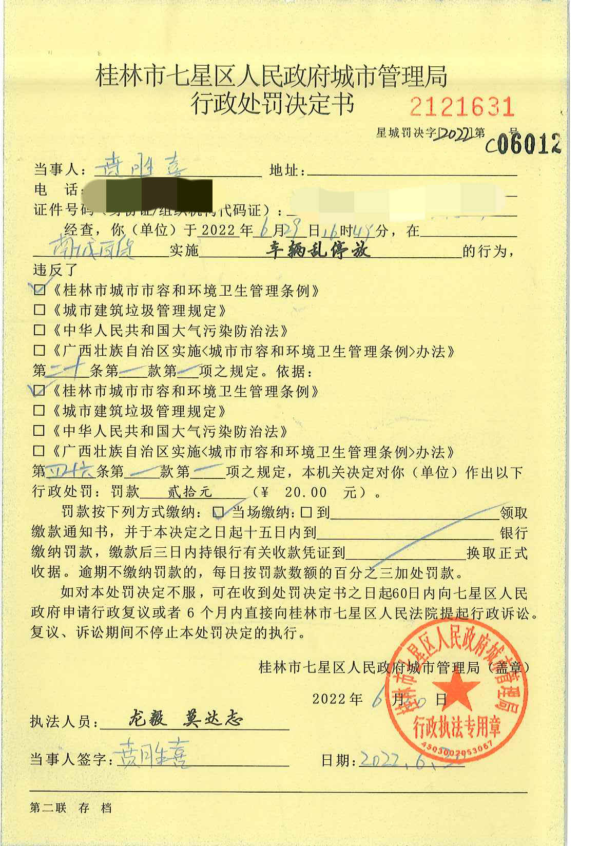 桂林市七星区城市管理局行政处罚决定书星城罚决字〔2022〕第C06012号-贲胜喜