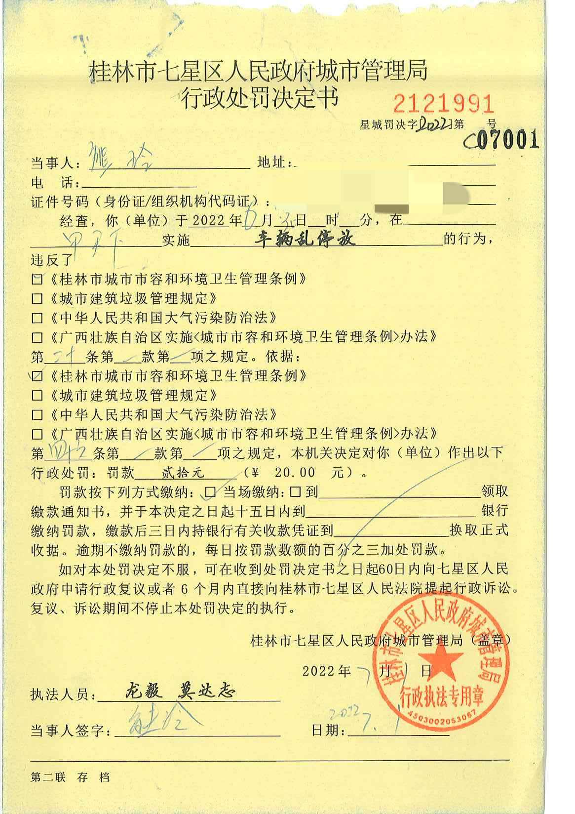 桂林市七星区城市管理局行政处罚决定书星城罚决字〔2022〕第C07001号-熊玲