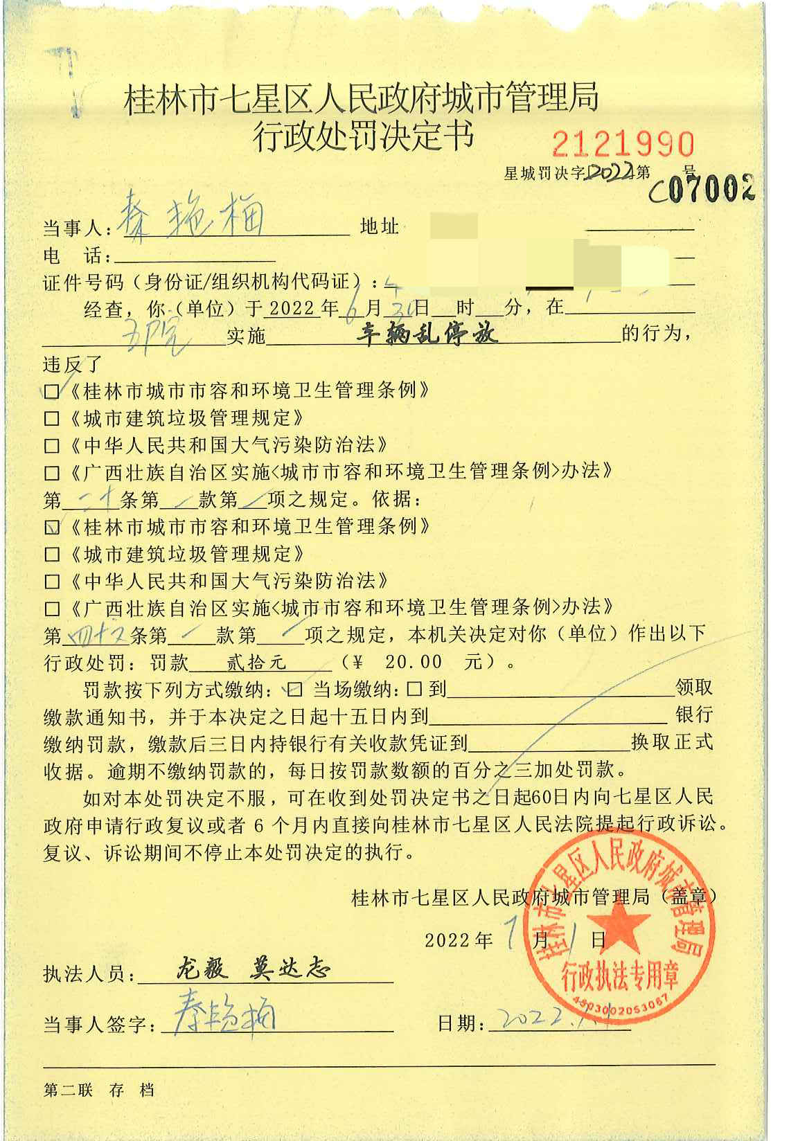 桂林市七星区城市管理局行政处罚决定书星城罚决字〔2022〕第C07002号-秦艳梅