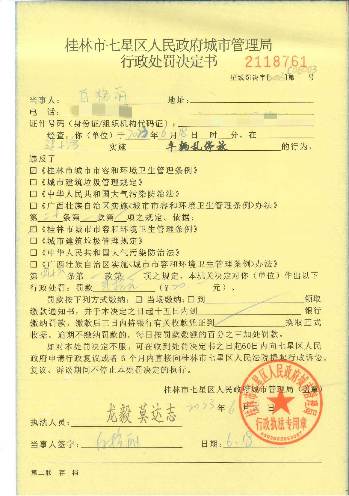 桂林市七星区城市管理局行政处罚决定书星城罚决字〔2023〕第C06003号-白格丽