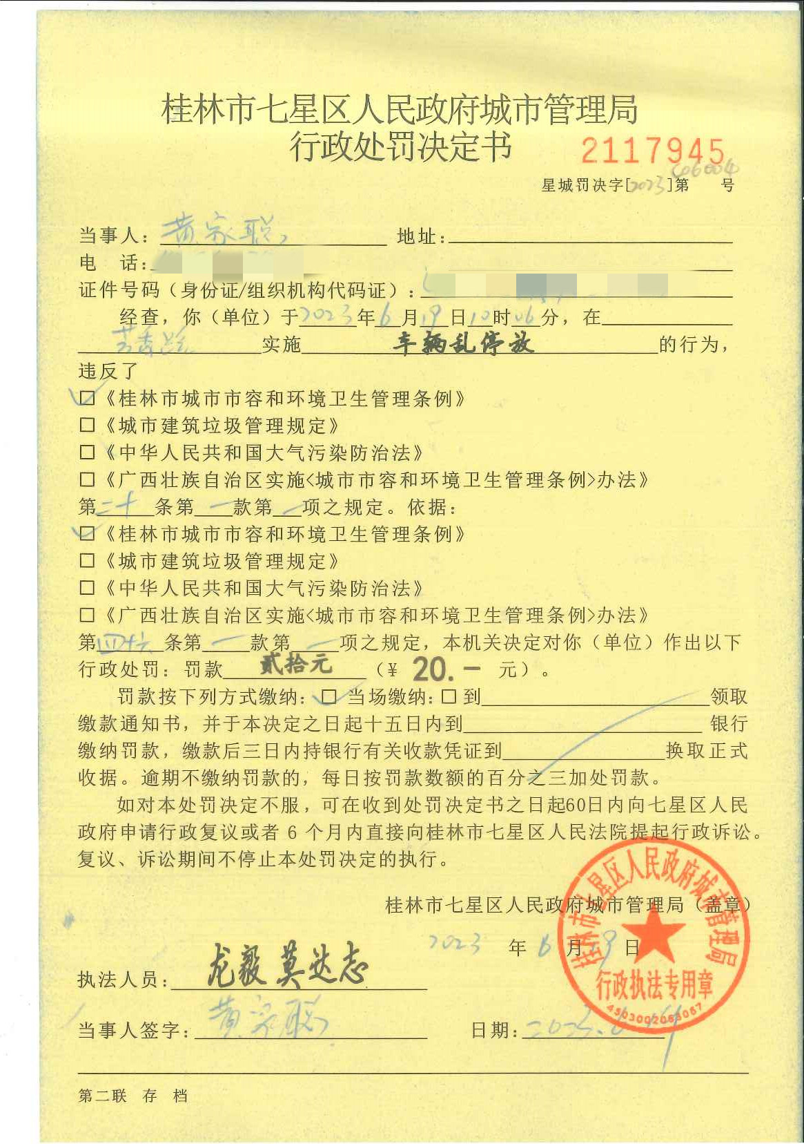 桂林市七星区城市管理局行政处罚决定书星城罚决字〔2023〕第C06004号-黄家聪
