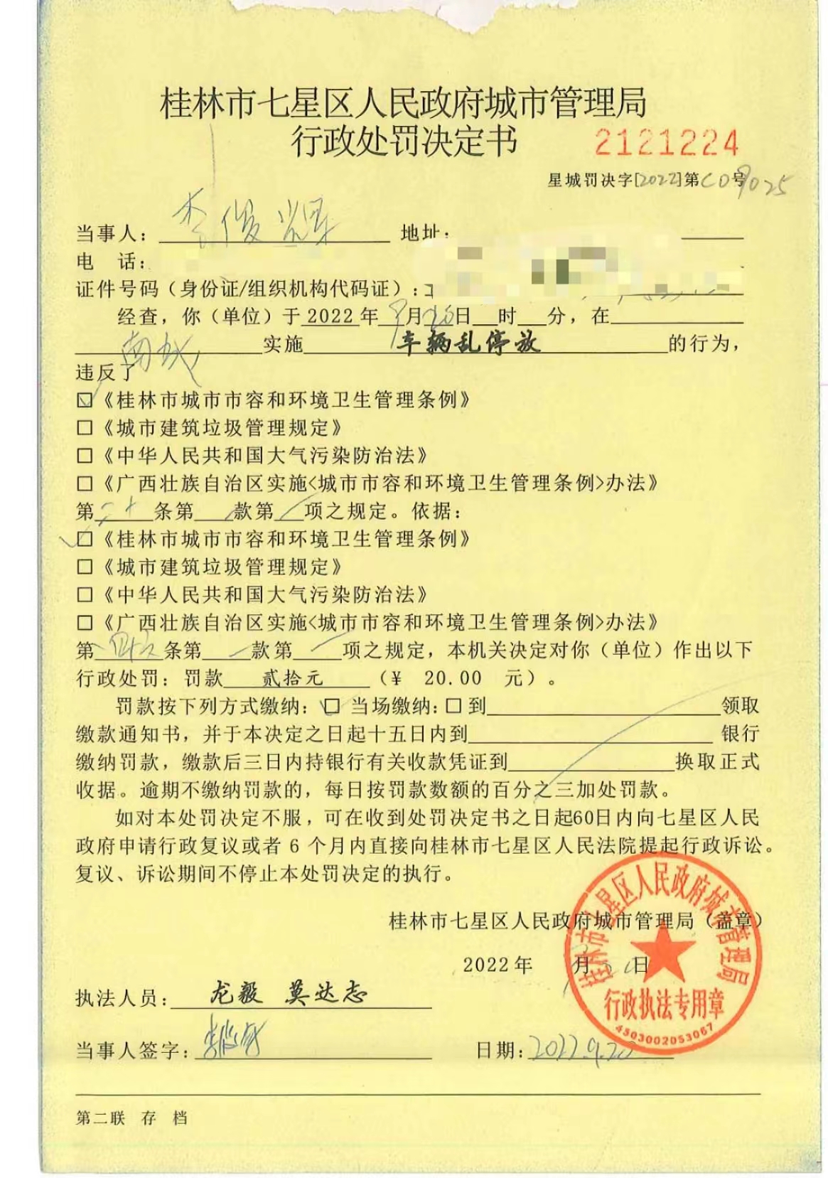 桂林市七星区城市管理局行政处罚决定书星城罚决字〔2022〕第C09025号-李俊辉