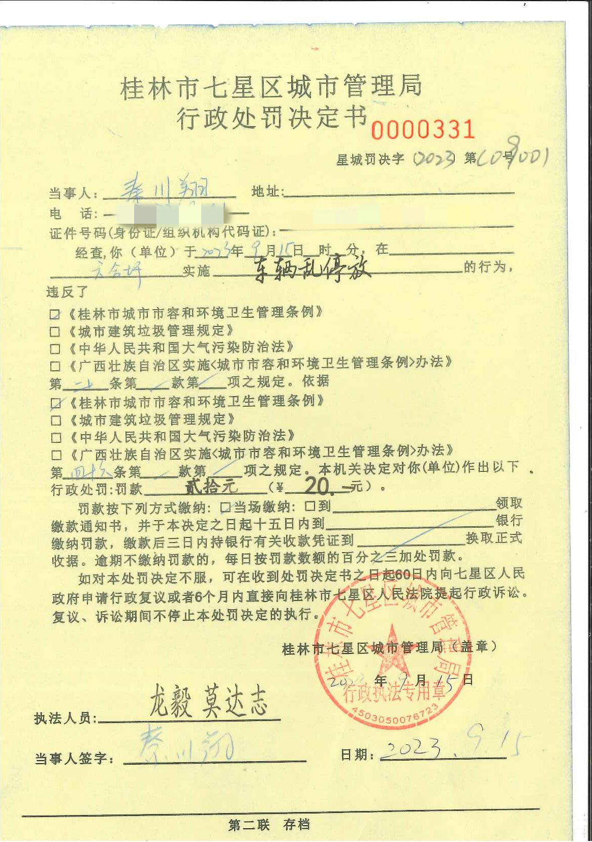 桂林市七星区城市管理局行政处罚决定书星城罚决字〔2023〕第C09001号-秦川翔